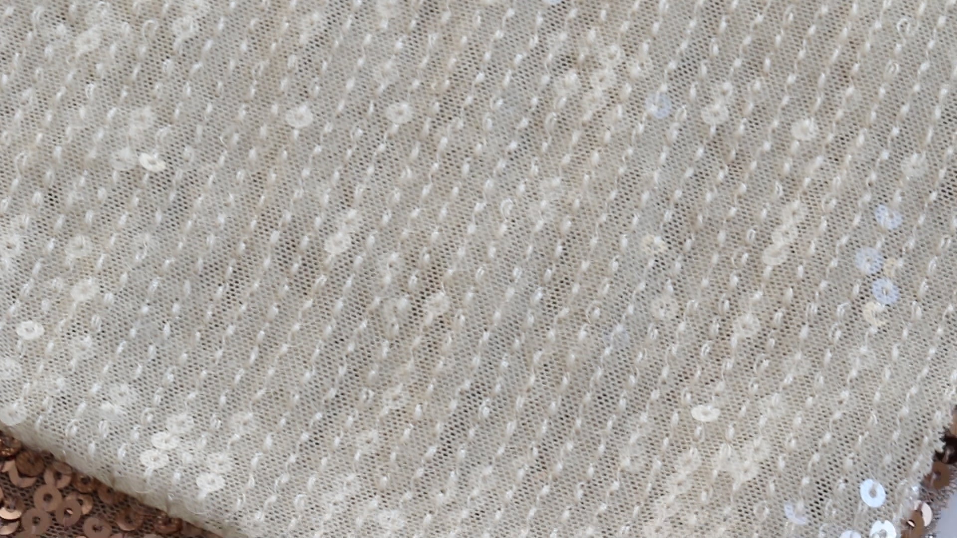 Кружево на тонкой сетчатой основе, украшенное нашитыми пайетками, изготовлено из 94% полиэстера и 6% эластана. Оно создает впечатляющий эффект на свету: переливающиеся пайетки меняют оттенок в зависимости от угла и движения, а кружево остается легким и гибким. Процент эластана придает ему заметную эластичность, что помогает материалу лучше ложиться и быть более комфортным, особенно в изделиях, требующих более плотного прилегания к телу.