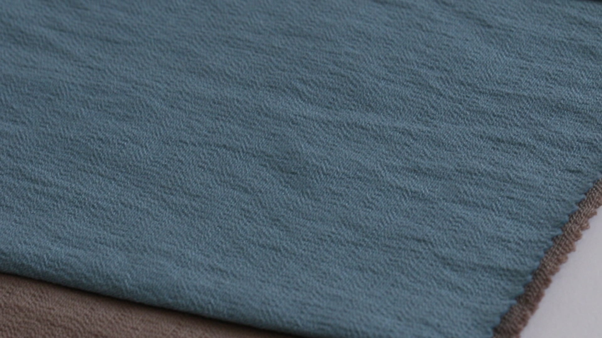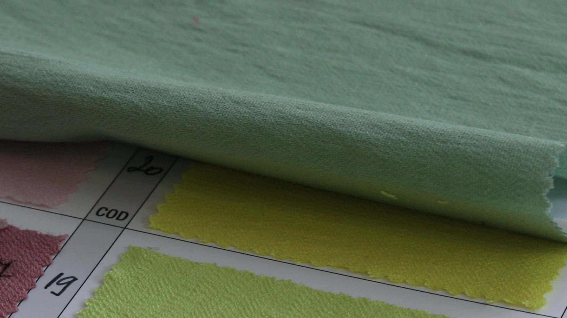 Однотонная ткань с гладкой поверхностью и слегка матовым видом, изготовленная из 80% вискозы и 20% нейлона. Вискоза придает ей текучесть и приятное, «мягкое» на ощупь ощущение, с элегантной драпировкой, а нейлон придает прочность, стабильность и меньше сминаемости, чем чистая вискоза. Это тот вид материала, который хорошо смотрится в простых фасонах, но достаточно подвижен, чтобы не казаться жестким.